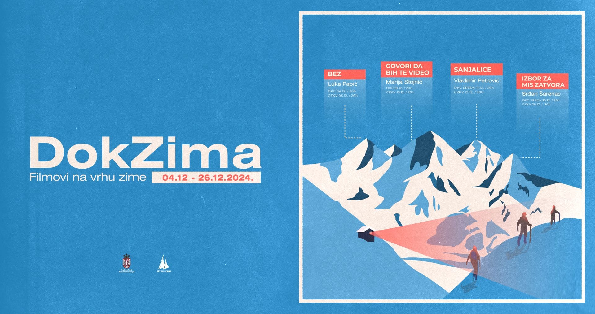 Dokumentarni film „Sanjalice“ reditelja Vladimira Petrovića biće prikazan u okviru drugog izdanja smotre dokumentarnog filma DokZima. Projekcije će se održati u sredu, 11. decembra, u Dvorani Kulturnog centra Beograda i u četvrtak, 12. decembra, u 20 časova u Centru za kulturu Valjevo (CZKV). Nakon obа prikazivanja publika će imati priliku da učestvuje u razgovoru sa autorom filma.